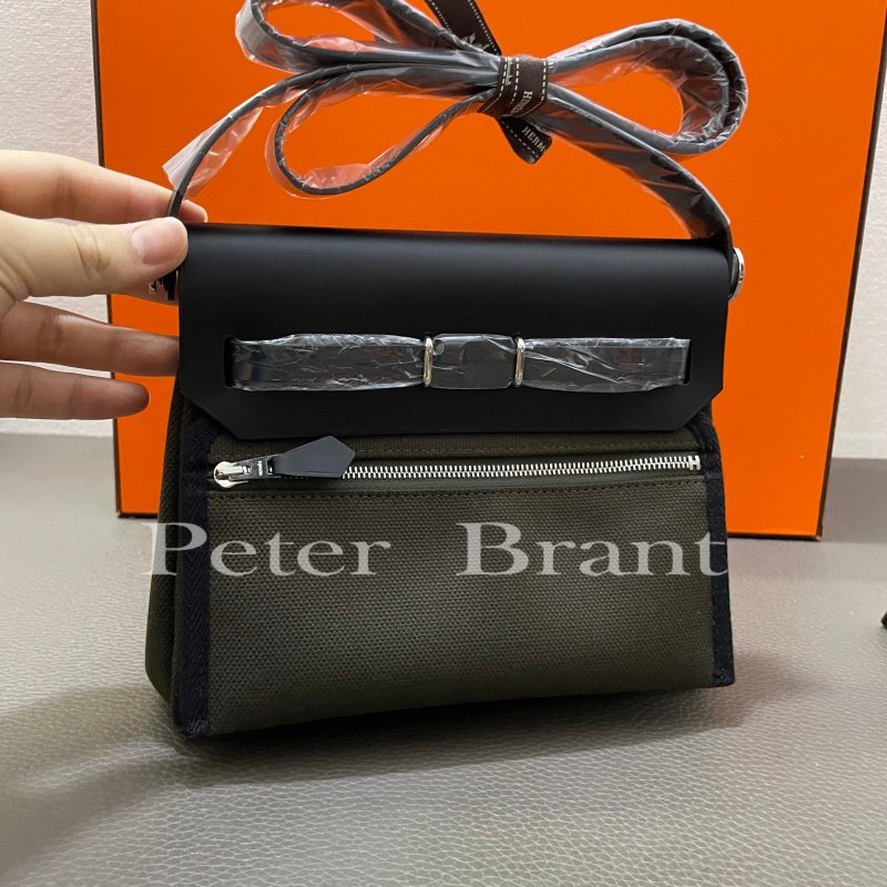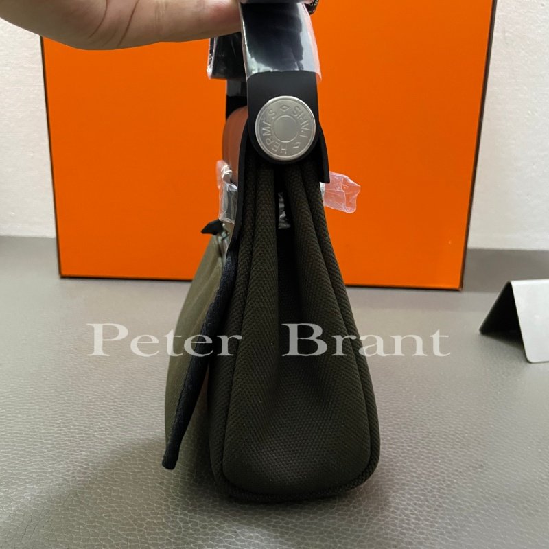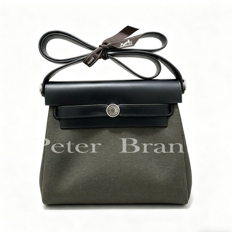 / Hermès Herbag Zip PM Olive Green Canvas & Black Swift Leather Handbag with Palladium Hardware